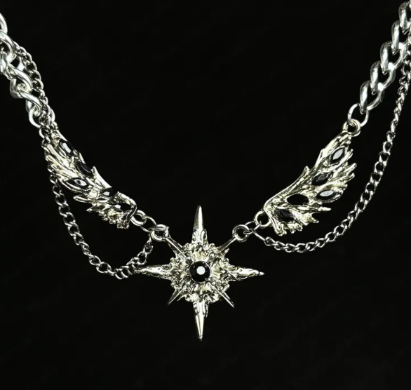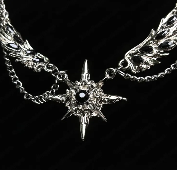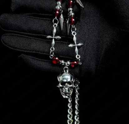 This Gothic necklace captures the essence of dark romance and timeless beauty. Inspired by the mystique of vintage gothic fashion, it features intricate metalwork that gleams with silver undertones, creating an aura of mystery and power.