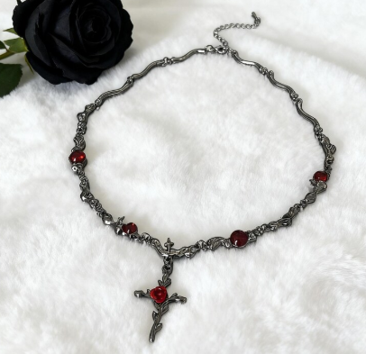 Step into the world of dark romance with the Crimson Rose Cross Necklace, a mesmerizing blend of vampire allure and dark academia elegance. This statement choker features a blood-red crystal rose entwined with silver thorn details, centered around an intricate gothic cross pendant—symbolizing passion, mystery, and eternal beauty.
