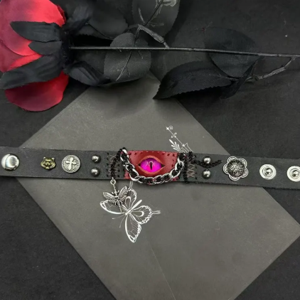 Make a bold and mystical statement with the Dragon Eye Punk Leather Cuff, a handcrafted piece that fuses punk rebellion with gothic dark fantasy aesthetics. This unique bracelet features a vivid pink dragon eye centerpiece, red and black leather layers, chain rivets, and a delicate butterfly charm, creating a striking blend of edge and elegance.