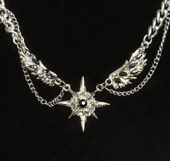 Featuring a black gem star pendant wrapped in intricate angel wings, this piece captures the essence of a celestial being cast from the heavens — powerful, untamed, and breathtaking.