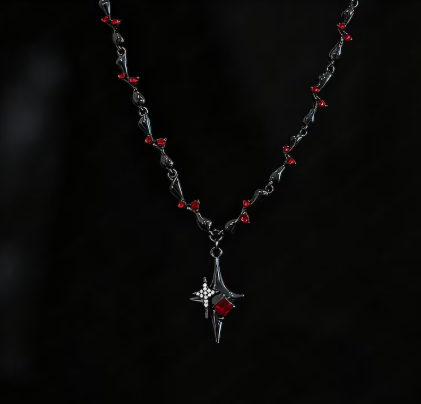Crafted from high-quality alloy with a dark metallic finish, the necklace glimmers subtly under the light, giving off an enchanting, otherworldly aura. Perfect for those who love dark fantasy aesthetics, it complements both casual gothic looks and dramatic evening outfits.